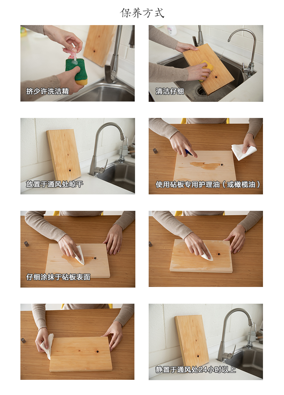 2??第一次使用前建議做涂油保養(yǎng)可預防木質砧板變形、開裂、染色等情況的發(fā)生(圖9)。