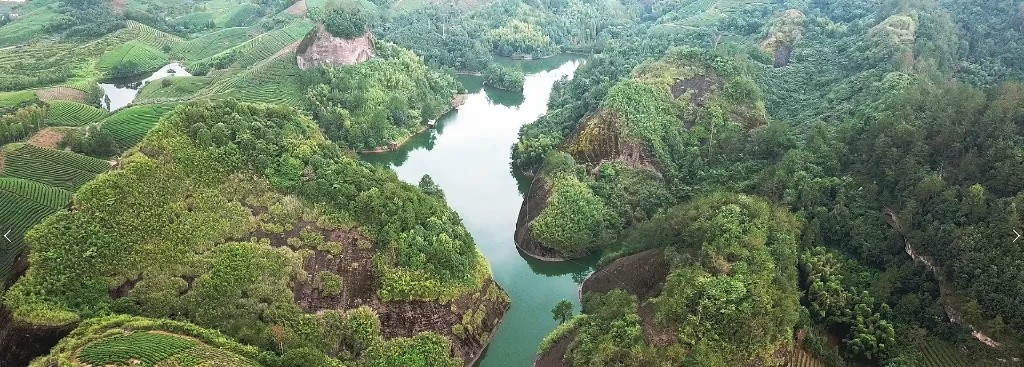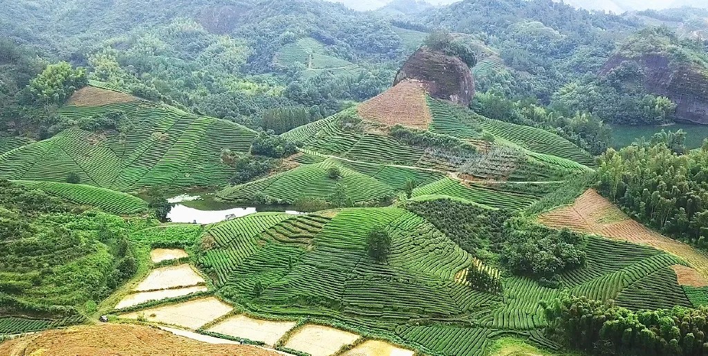 陣陣清風(fēng),吹過一片片稻田;山野之間,一座座錯落有致的茶園綠意盎然,丹霞山馮、丘陵、果園、老屋……隱藏在一方綠意蔥蘢的小天地之中,隱約傳來“嘩嘩嘩”的溪水聲……
