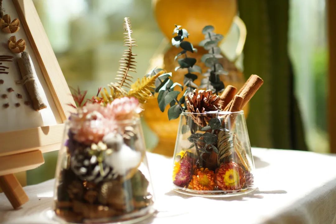 在銀杏林站-自然美學手作館,自然是永恒不變的探索主題,人們可以在此把從植物或動物身上獲取的靈感,通過手作的方式二次創(chuàng)作成帶有個人審美情趣的美好之物,用以裝點生活。館內(nèi)常態(tài)課程選擇有植物浮游瓶、玻璃押花、無火香薰杯、小花環(huán)、植物胸章,上手簡單,形式多樣,選擇喜歡的手作方式來表達自己吧!