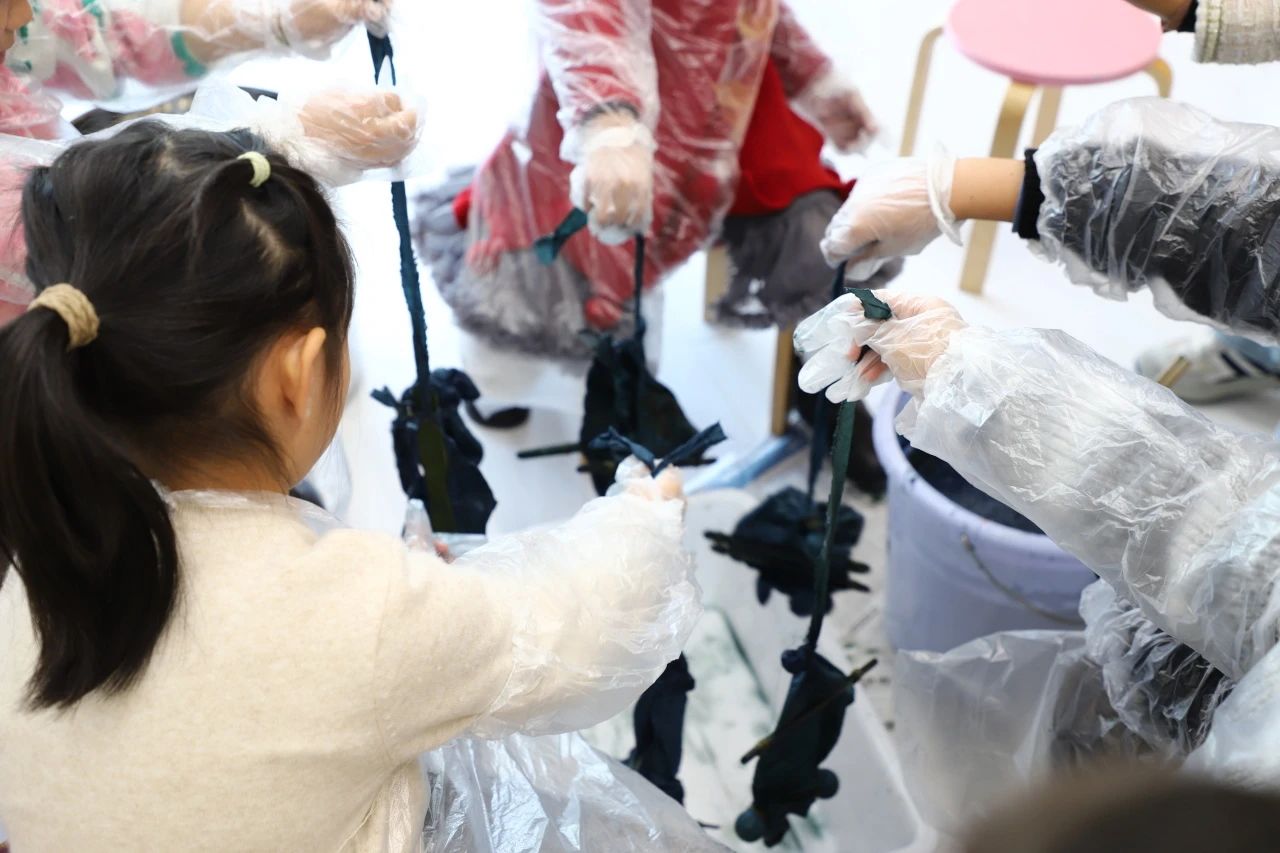 在每期的活動里,小朋友們在荻原公教老師的帶領(lǐng)下運用古老的植物染工藝,染出絢爛色彩,扎染出舒適而溫暖的枕頭和造型各異的小動物。