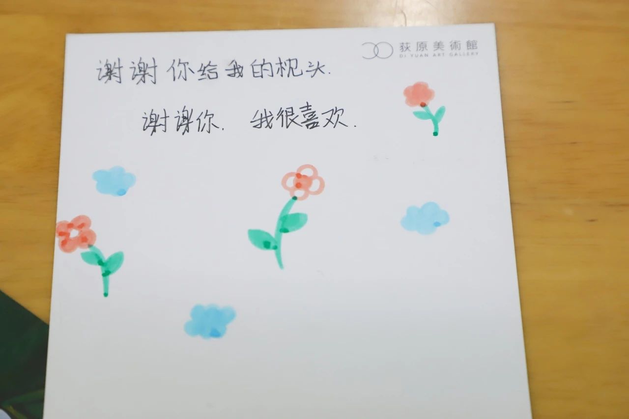 1月14日下午,荻原美術(shù)館工作人員帶著小朋友們留存下的枕頭來到了嘉興市福利院,在福利院老師的協(xié)助下,向小朋友們送上了載著“愛與夢”的枕頭。而福利院的小朋友們也用稚拙的語言和繪畫表達了感謝,手寫了一封“回信”。