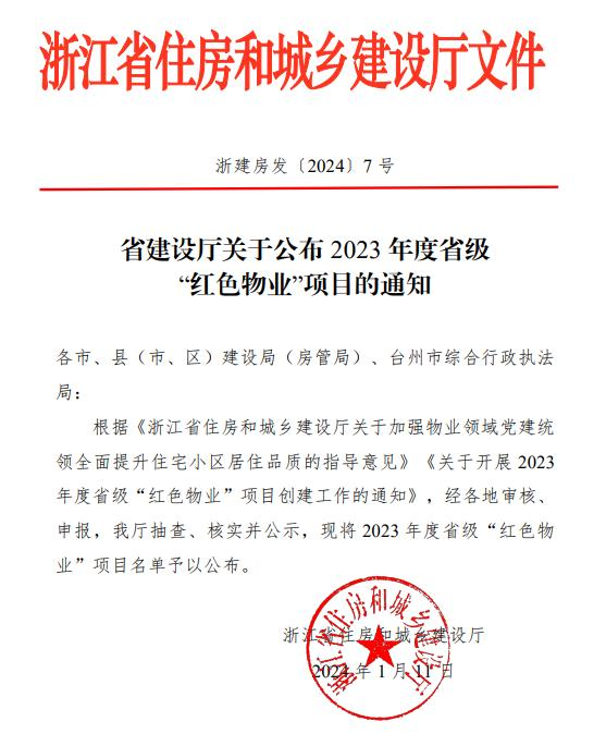浙江省住房和城鄉(xiāng)建設(shè)廳發(fā)布《關(guān)于公布 2023年度省級(jí)“紅色物業(yè)”項(xiàng)目的通知》(浙建房發(fā)〔2024〕7號(hào))中御上江南小區(qū)物業(yè)服務(wù)項(xiàng)目獲評(píng)2023年度省級(jí)“紅色物業(yè)”項(xiàng)目。