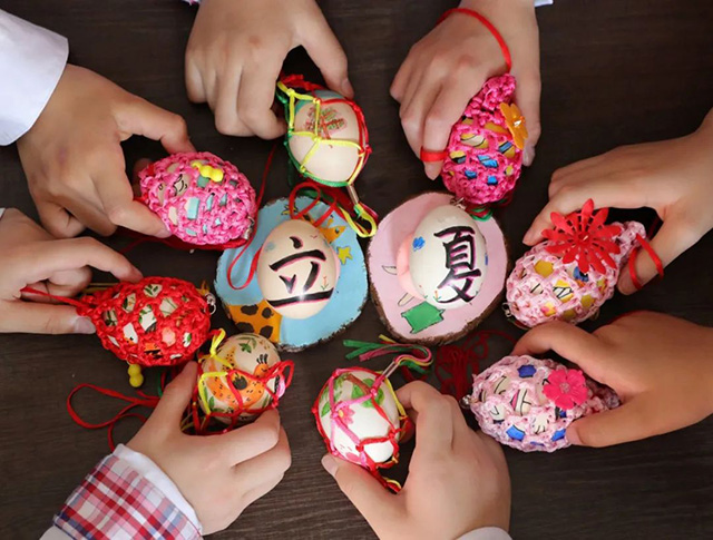 用立夏繩做蛋套在胸前掛住立夏蛋,保佑孩子夏天的平安,是立夏的老傳統(tǒng)了。