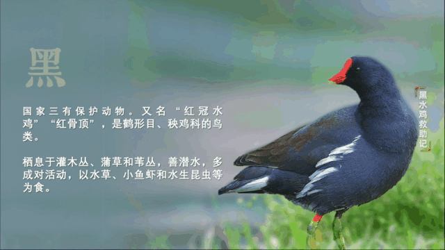 經(jīng)陸生野生動(dòng)物保護(hù)協(xié)會(huì)專家人員鑒定,這只黑色幼鳥是黑水雞,屬于國(guó)家“三有”保護(hù)動(dòng)物,“黑水雞”又名“紅冠水雞”“紅骨頂”,是鶴形目、秧雞科的鳥類。棲息于灌木叢、蒲草和葦叢,善潛水,多成對(duì)活動(dòng),以水草、小魚蝦和水生昆蟲等為食。