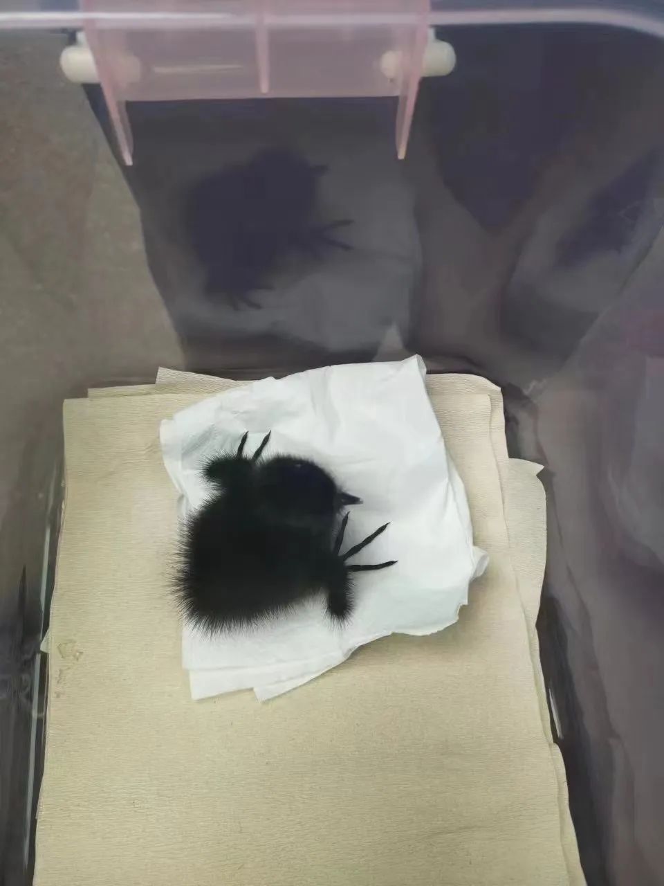 等待期間,袁何川將黑色幼鳥從草叢中小心捧起,將他放置在盒子中。小鳥似乎知道有人在幫助它,沒(méi)有任何反抗掙扎,只是轉(zhuǎn)動(dòng)著它的大眼睛打量著大家。