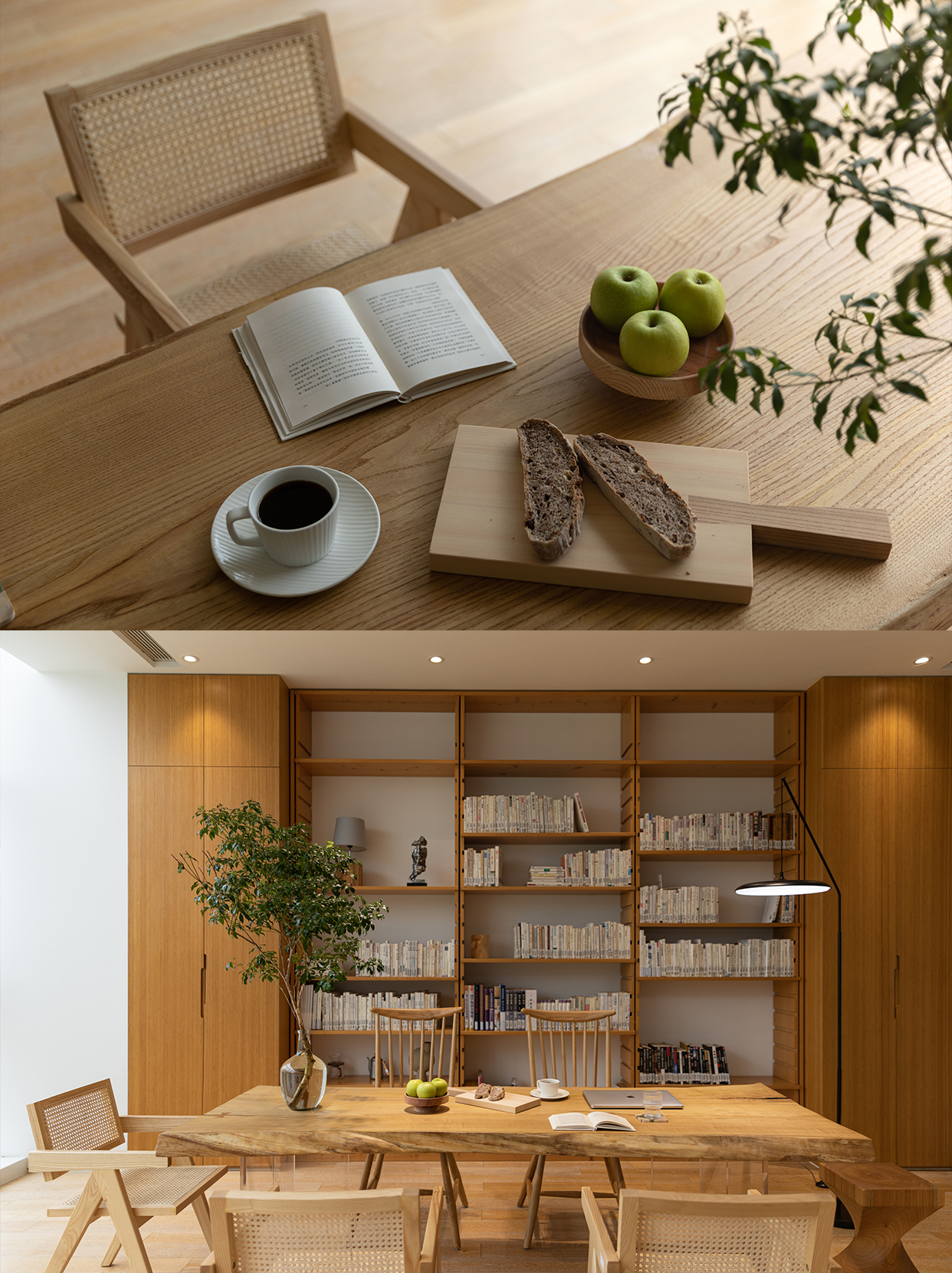 4??茶空間+咖啡角:在一張美貌與實(shí)用兼具的實(shí)木大長桌面前,你真的能忍住不來一杯茶or咖啡?周末會友、打發(fā)時(shí)間的最好伴侶。